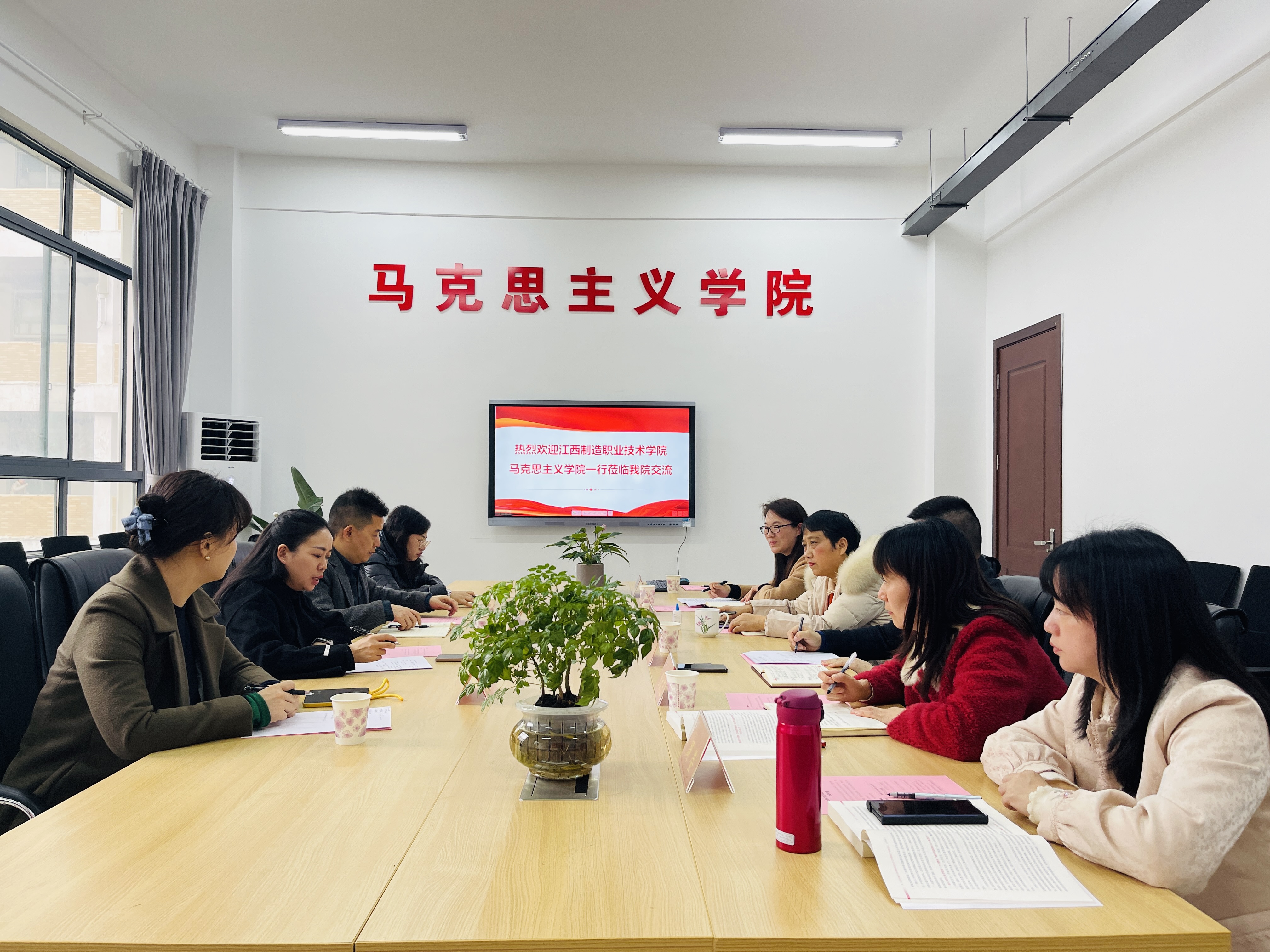 3月12日下午,江西制造职业技术学院马克思主义学院院长张艳一行来我校马克思主义学院进行交流。交流座谈会在马院会议室举行。马克思主义学院院长王利华,副院长刘爱国、陈帅及部分教师代表参加了座谈会。座谈会由刘爱国主持。